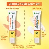 Protect your skin daily with the Garnier Vitamin C Daily UV Brightening Fluid Glow SPF50+, your essential shield against harmful UV rays and sun damage. This innovative, lightweight, and sheer glow formula is expertly created with mineral pigments, glyceryn and powerful SPF50 to help defend against UVB, UVA, and long-UVA rays, to effectively help reduce the appearance of dark spots. Beyond superior sun protection, it harnesses the brightening efficacy of Vitamin C, a renowned ingredient celebrated for enhancing complexion and promoting a radiant, healthy-looking glow.