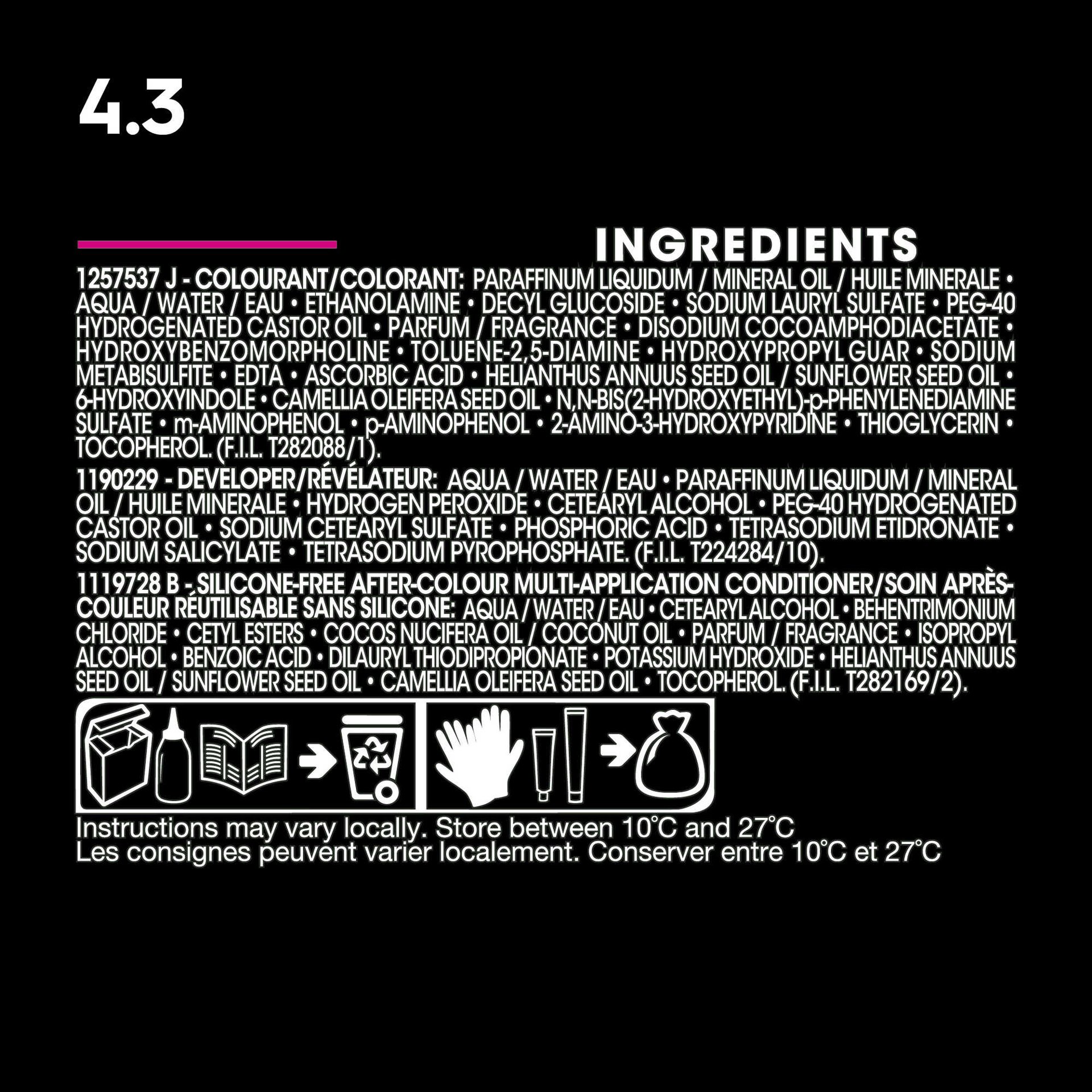 PARAFFINUM LIQUIDUM / MINERAL OIL / HUILE MINERALE ● AQUA / WATER / EAU ● ETHANOLAMINE ● DECYL GLUCOSIDE ● SODIUM LAURYL SULFATE ● PEG-40 HYDROGENATED CASTOR OIL ● PARFUM / FRAGRANCE ● DISODIUM COCOAMPHODIACETATE ● HYDROXYBENZOMORPHOLINE ● TOLUENE-2,5-DIAMINE ● p-AMINOPHENOL ● HYDROXYPROPYL GUAR ● SODIUM METABISULFITE ● 2-METHYL-5-HYDROXYETHYLAMINOPHENOL ● EDTA ● ASCORBIC ACID ● HELIANTHUS ANNUUS SEED OIL / SUNFLOWER SEED OIL ● CAMELLIA OLEIFERA SEED OIL ● m-AMINOPHENOL ● 2-AMINO-3-HYDROXYPYRIDINE ● 6-HYDROXYINDOLE ● THIOGLYCERIN ● TOCOPHEROL ●