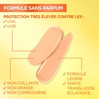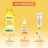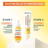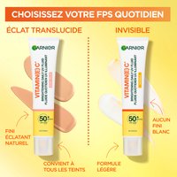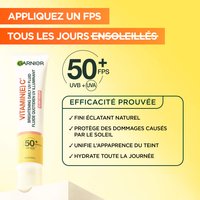 Protégez votre peau quotidiennement avec le Fluide Éclaircissant UV Quotidien Invisible SPF50+ de Garnier Vitamine C, votre bouclier essentiel contre les rayons UV nocifs et les dommages solaires. Cette formule innovante, légère et sans traces blanches est conçue par des experts avec de la vitamine E, de la glycérine et un puissant SPF50 pour aider à défendre contre les rayons UVB et UVA avec un fini éclatant supérieur instantané. Au-delà d'une protection solaire supérieure, elle exploite l'efficacité éclaircissante de la Vitamine C, un ingrédient réputé pour améliorer le teint et favoriser un éclat radieux et d'apparence saine.Haute Protection UV : Fournit un SPF 50+ à large spectre pour protéger la peau des rayons UVB et UVA, aidant à prévenir les dommages solaires et l'apparition des taches brunes ; Formule Éclaircissante : Enrichie en Vitamine C et Vitamine E, des antioxydants renommés célébrés pour améliorer le teint et favoriser un éclat radieux et d'apparence saine ; Fini Invisible : Offre un effet lumineux instantané sans traces blanches, laissant un fini non gras et non collant qui est impeccable pour toutes les carnations.